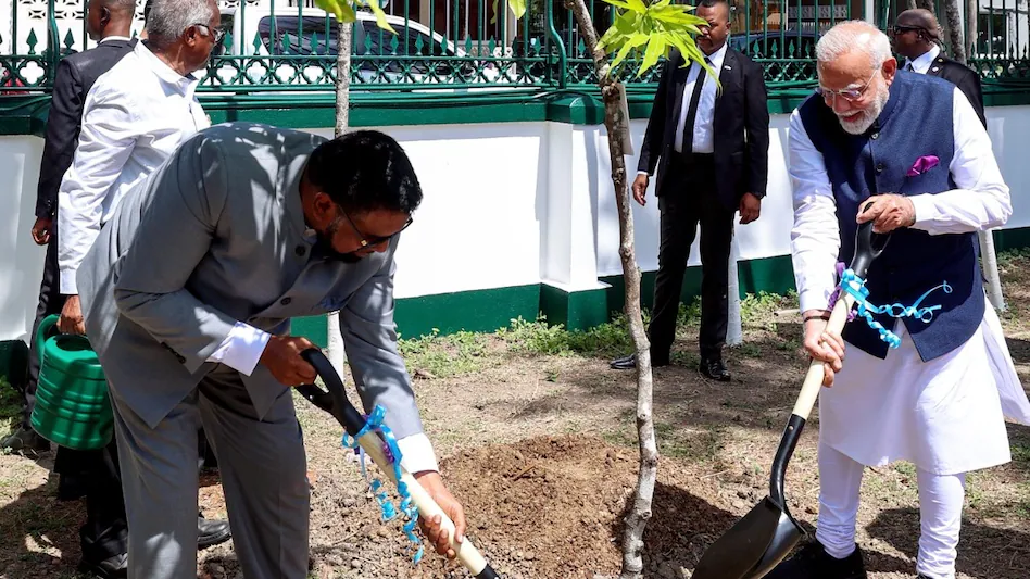 प्रधानमंत्री मोदी और राष्ट्रपति इरफान अली ने ‘एक पेड़ मां के नाम’ पहल के तहत जॉर्जटाउन में पौधा लगाया. बुधवार को गुयाना पहुंचे पीएम मोदी 50 साल से भी ज्यादा वक्त में गुयाना का दौरा करने वाले पहले भारतीय प्रधानमंत्री हैं.