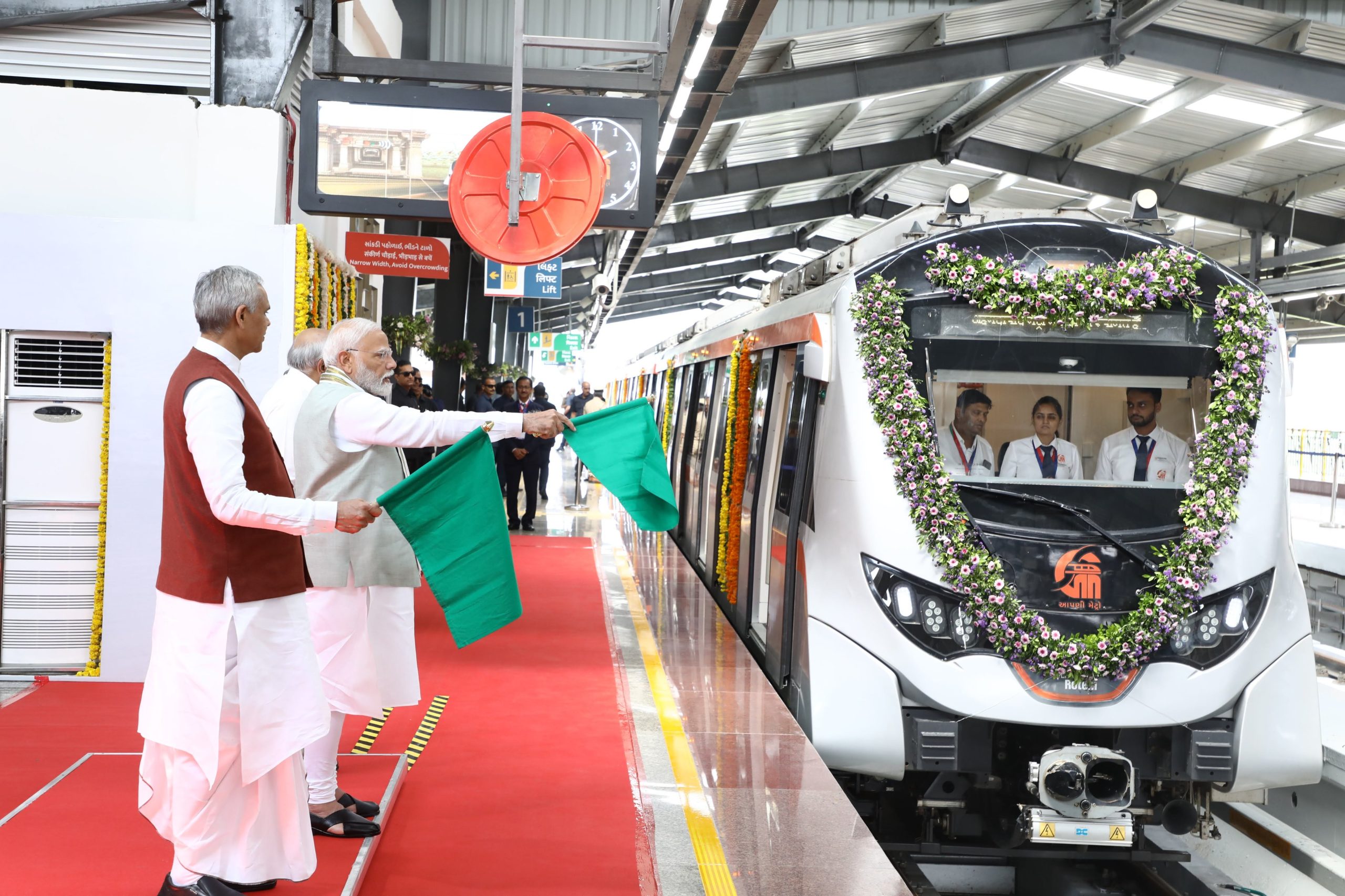 प्रधानमंत्री नरेंद्र मोदी ने गुजरात के राज्यपाल आचार्य देवव्रत और मुख्यमंत्री भूपेंद्र पटेल के साथ गांधीनगर के लिए मेट्रो को रवाना किया। प्रधानमंत्री ने इसके बाद मेट्रो में यात्रा भी की और इसमें मौजूद युवाओं से बातचीत की। इससे पहले पीएम मोदी ने गांधीनगर के शालीन इलाके में पीएम ने पीएम सूर्य घर मुफ्त बिजली योजना के लाभार्थियों से मुलाकात की। मुख्यमंत्री ने 20.8 किलोमीटर लंबे मेट्रो नेटवर्क का उद्घाटन किया।