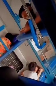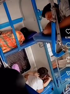 वीडियो में देखा जा सकता है कि रात का समय है, ट्रेन के ज्यादातर यात्री सो चुके हैं, लेकिन लाइट अब भी चालू है। इसी दौरान, दोनों एक-दूसरे के करीब आते नजर आते हैं और सार्वजनिक जगह पर अनुचित व्यवहार करने लगते हैं। आसपास के बर्थ पर अन्य यात्री भी मौजूद हैं, जो इस स्थिति से अनजान या नजरअंदाज करते हुए दिखाई देते हैं।