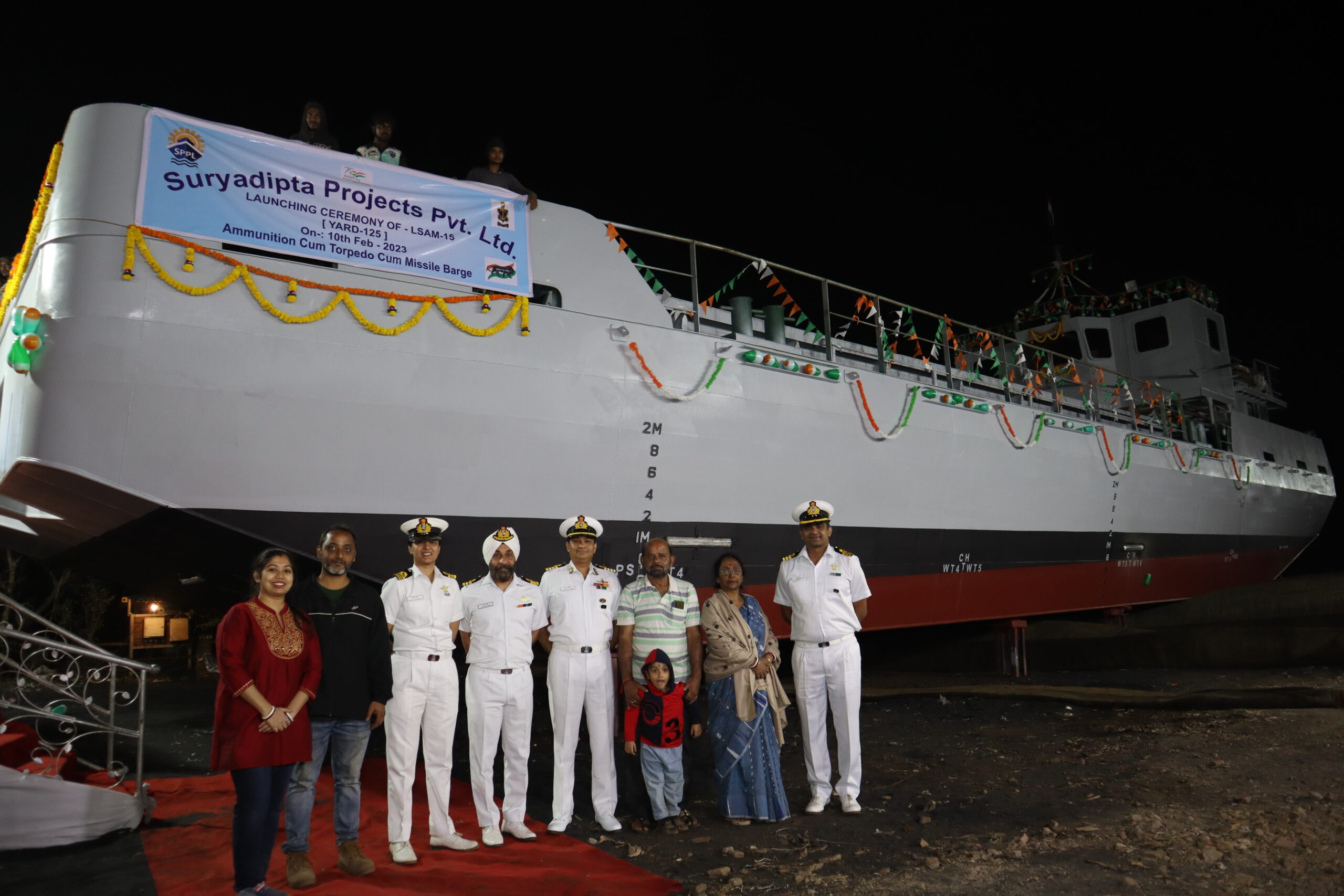 गोला बारूद सह टॉरपीडो सह मिसाइल (एसीटीसीएम) बार्ज नौका यार्ड 125 (एलएसएएम 15) का एडब्ल्यूपीएस (एमबीआई) कैप्टन प्रशांत सक्सेना द्वारा 10 फरवरी 2023 को ठाणे के मैसर्स सूर्यदीप्त प्रोजेक्ट्स प्राइवेट लिमिटेड में शुभारंभ किया गया। स्वदेशी निर्माताओं से प्राप्त सभी प्रमुख एवं सहायक उपकरणों/प्रणालियों के साथ यह छोटा जहाज रक्षा मंत्रालय की “मेक इन इंडिया” पहल का गौरवशाली युद्ध सहायक पोत है।