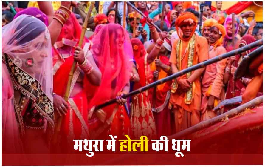 उमाकांत त्रिपाठी। राधा रानी की नगरी बरसाना में सोमवार शाम को 2 घंटे तक लट्ठमार होली खेली गई। नंदगांव के हुरियारे सज-धज कर पहुंचे। हुरियारिनों ने उन्हें लाठियों से खूब पीटा। वो हंसते हुए ढाल लगाकर बचते रहे। छतों से अबीर-गुलाल और रंग बरसा। श्रीजी मंदिर में 10 क्विंटल से ज्यादा रंग-गुलाल उड़े। हर तरफ राधा-कृष्ण के जयकारे गूंजे।