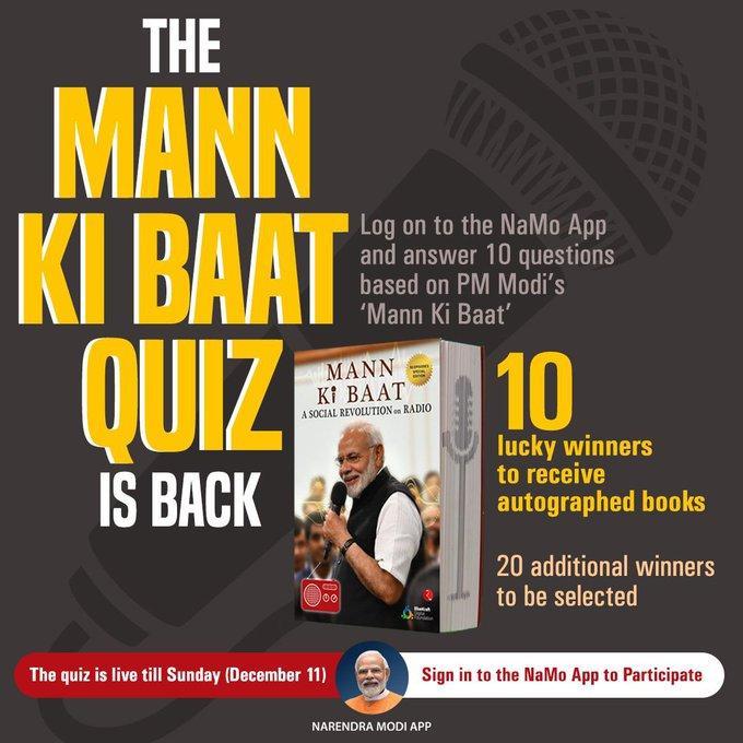 “हमने इस महीने के दौरान #MannKiBaat में विभिन्न सामुदायिक प्रयासों सहित विविध विषयों को कवर किया है। आप लोग नमो एप पर एमकेबी क्विज में भाग लें।”