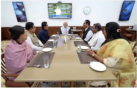 उमाकांत त्रिपाठी। प्रधानमंत्री नरेंद्र मोदी ने शुक्रवार को संसद की कैंटीन में कई राजनीतिक दलों के सांसदों के साथ लंच किया। कुछ मीडिया रिपोर्ट्स में सूत्रों के हवाले से दावा किया गया कि इन सांसदों को दोपहर ढाई बजे इस अनौपचारिक लंच की सूचना मिली। प्रधानमंत्री जब कैंटीन में पहुंचे तो सांसदों से कहा मेरे साथ चलिए, आपको सजा नहीं दूंगा। प्रधानमंत्री के साथ लंच में भाजपा सांसद हिना गावित, एस फेंगनोन कोन्याक, जामयांग नाम्ग्याल, एल मुरुगन, TDP सांसद राम मोहन नायडू, बसपा सांसद रितेश पांडे और BJD सांसद सस्मित पात्रा मौजूद थे। प्रधानमंत्री और सांसदों की यह लंच मीटिंग करीब 45 मिनट चली।
