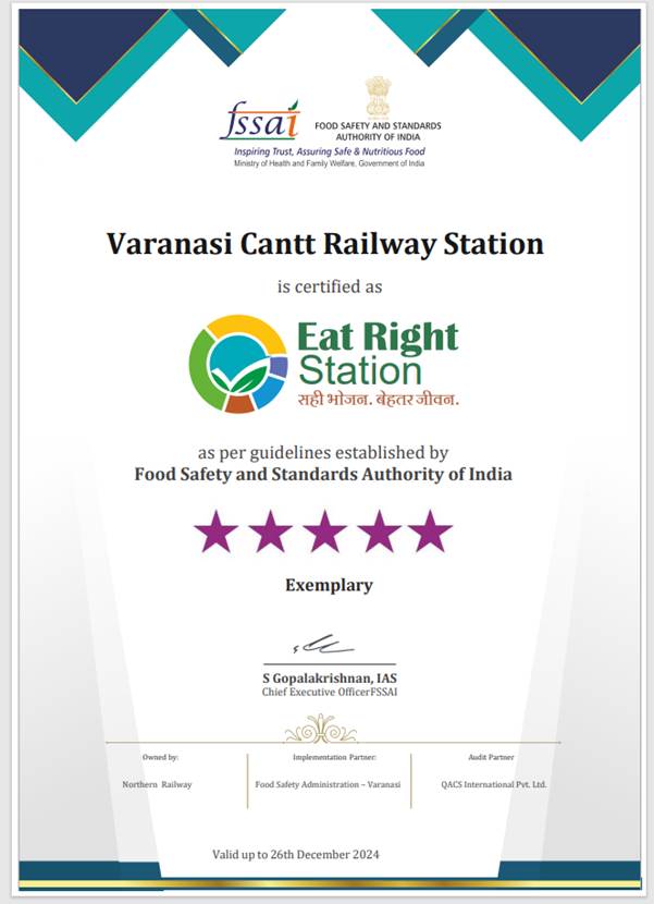 भारतीय रेलवे के वाराणसी छावनी रेलवे स्टेशन को यात्रियों को उच्च गुणवत्ता वाला पौष्टिक भोजन प्रदान करने के लिए 5-स्टार रेटिंग के साथ ‘ईट राइट स्टेशन’ प्रमाणन से सम्मानित किया गया है। यह प्रमाणीकरण भारतीय खाद्य संरक्षा एवं मानक प्राधिकरण-एफ़एसएसएआई द्वारा रेलवे स्टेशनों को मानक खाद्य भंडारण और स्वच्छता प्रथाओं का पालन करने के लिए प्रदान किया जाता है। भारतीय खाद्य संरक्षा एवं मानक प्राधिकरण द्वारा ‘ईट राइट स्टेशन’ प्रमाणन उन रेलवे स्टेशनों को प्रदान किया जाता है जो यात्रियों को सुरक्षित और पौष्टिक भोजन प्रदान करने के बारे में मानदंड स्थापित करते हैं। स्टेशन को 1 से 5 तक की रेटिंग वाली भारतीय खाद्य संरक्षा एवं मानक प्राधिकरण-अनुसूचित तृतीय-पक्ष ऑडिट एजेंसी के निष्कर्ष पर एक प्रमाण पत्र से सम्मानित किया जाता है। 5-स्टार रेटिंग यात्रियों को सुरक्षित और स्वच्छ भोजन उपलब्ध कराने के लिए स्टेशन द्वारा पूर्ण अनुपालन का संकेत प्रदान करती है।
