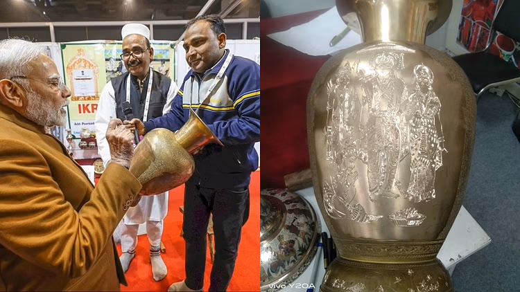 प्रधानमंत्री नरेंद्र मोदी नई दिल्ली के भारत मंडपम में आयोजित ग्रामीण भारत महोत्सव में पीतल के कलश पर उकेरी गई अपनी मां हीराबेन का चित्र देखकर आश्चर्यचकित हो गए. उन्होंने चित्र उकेरने वाले शिल्पगुरु इकराम हुसैन से पांच मिनट तक बातचीत की. उनके हुनर की सराहना करते हुए पीठ थपथपाई. प्रधानमंत्री से मिली शाबाशी से शिल्पगुरु और उनके परिजन बेहद उत्साहित हैं.