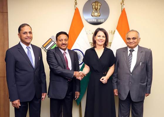 जर्मनी की विदेश मंत्री महामहिम अन्नालीना बेयरबॉक के नेतृत्व में एक शिष्टमंडल ने आज नई दिल्ली स्थित निर्वाचन सदन में मुख्य चुनाव आयुक्त राजीव कुमार और चुनाव आयुक्तों अनूप चंद्र पाण्डेय व अरुण गोयल से मुलाकात की। जर्मनी की विदेश मंत्री के साथ जर्मनी की सांसद आगनियेश्का ब्रगर, टॉमस अर्नडल, उलरिख लेश्ते, आंद्रियास लारेम, भारत में जर्मनी के राजदूत महामहिम डॉ. फिलिप ऐकरमन और जर्मन विदेश विभाग के अन्य अधिकारी शामिल थे।